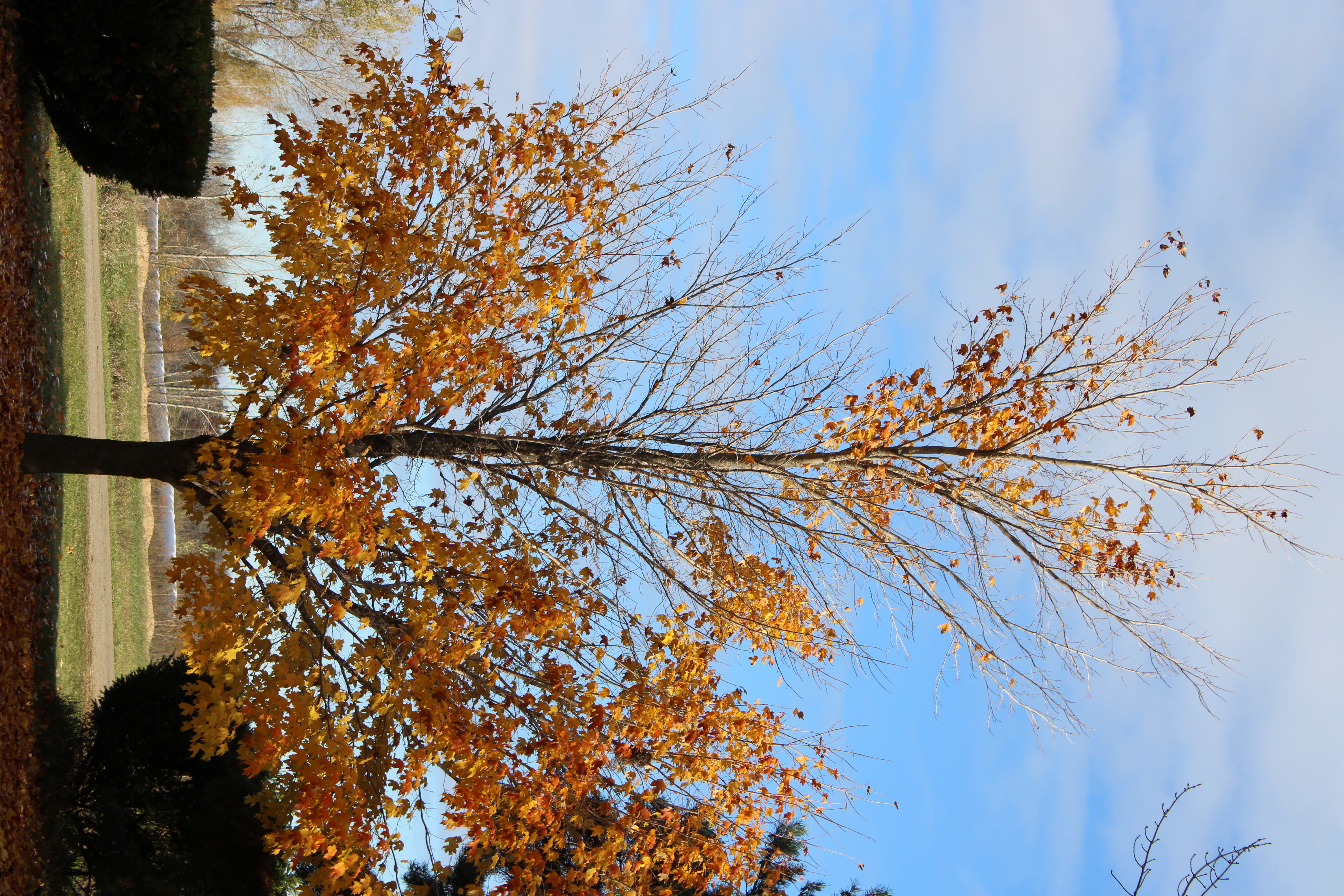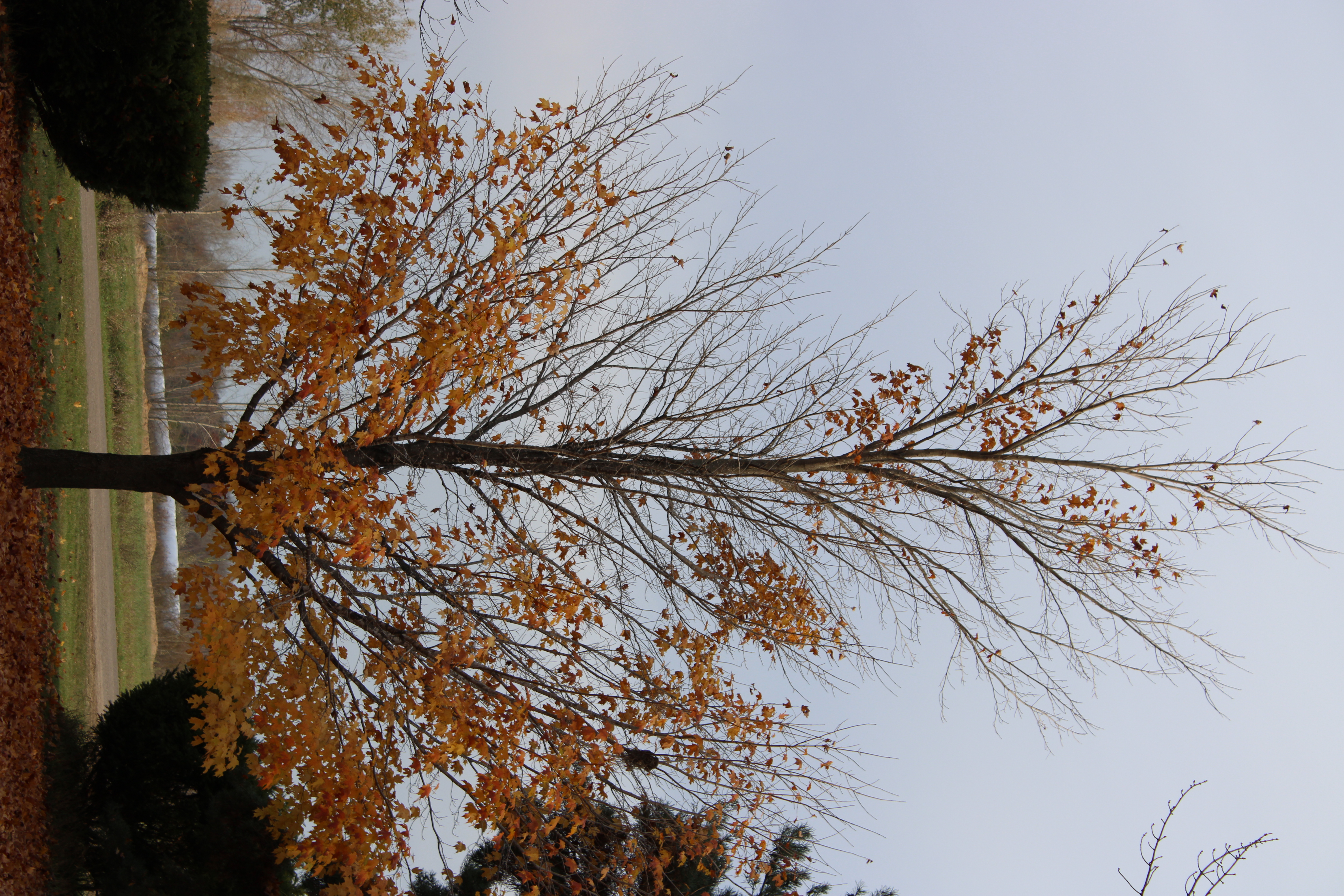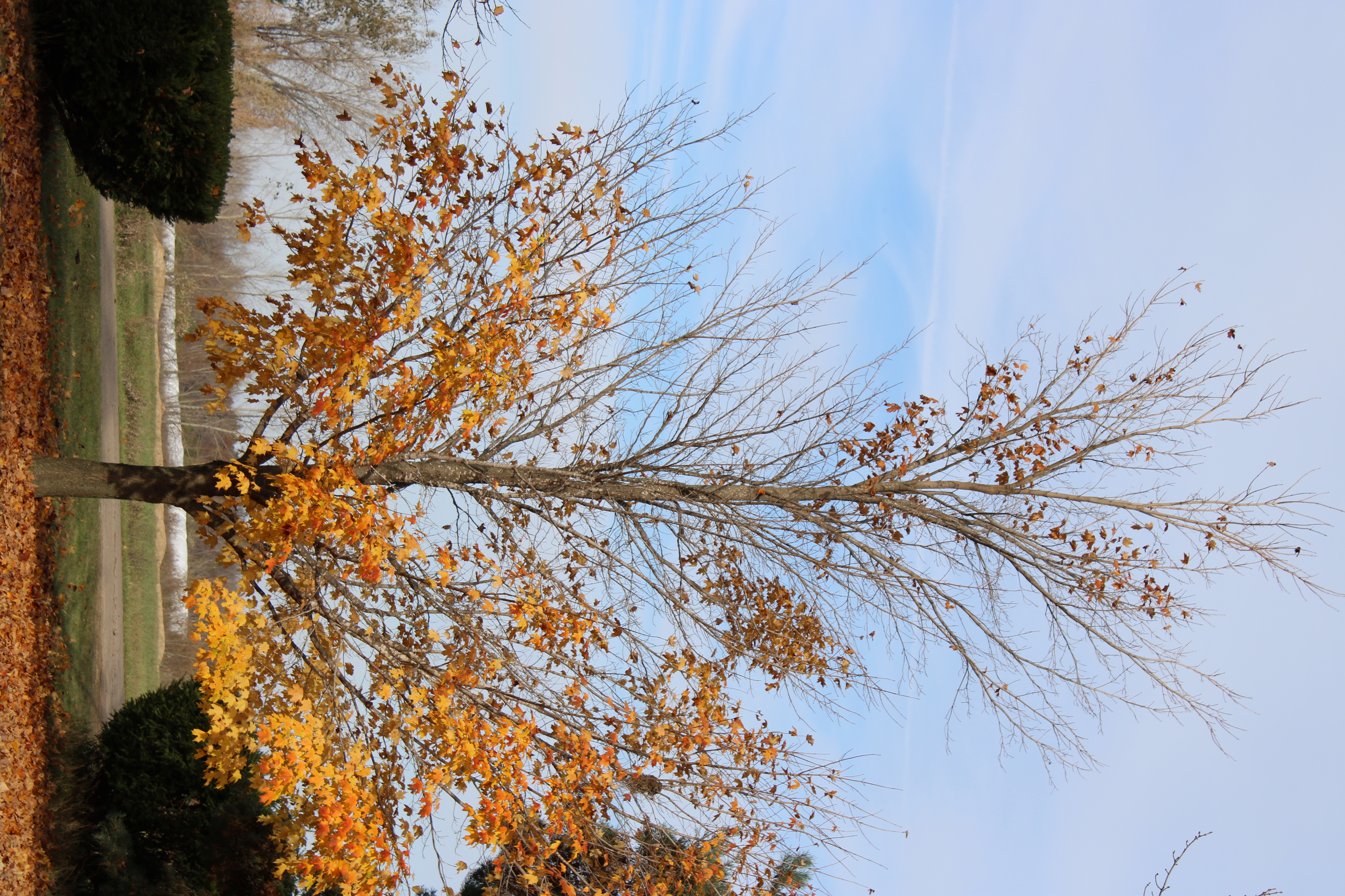 I took these pictures of my sugar maple tree as it lost its leaves during a quick couple weeks during the fall of 2023. The first photo was taken on Sunday, October 29 and the final picture was taken on Thursday, November 9. The iridescent orange (quite eye-catching when there is some sun) quickly fades and the leaves fall even quicker as wind, rain, and cold batter the spent leaves.